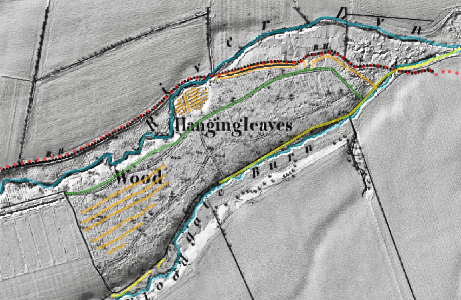 Hanging Leaves Wood sits east of the lands of Juliana; its northern edge coincides with the major estates boundary. Max Adams and Colm O’Brien outlined the history of the area and its relationship to surrounding lands, concentrating on ancient charters, routeways, drove roads, estate boundaries, etc. There is a prominent ditch and embankment facing north from Hanging Leaves Wood (in the map below it is shown on a composite OS 1st Edition and LiDAR plot: where red dots and yellow lines coincide).