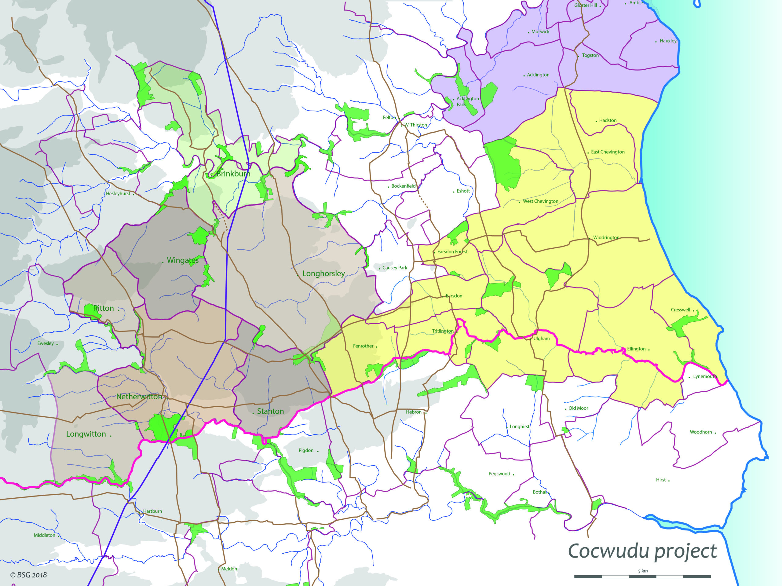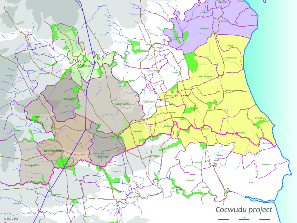 [Note by Max Adams: The townships of Juliana’s estate have survived largely intact (shades of brown in the map below). Together with the course of the River Lyne, itself a boundary of estates (shaded yellow in the map below) first recorded in the 8th century, they form a continuous boundary feature rising in the Pennines and running some 30km to the sea at Lynemouth – highlighted in purple on the map below.]